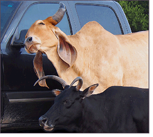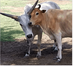 When I was growing up in Central Texas, my dad had a hobby herd of registered Polled Hereford cattle from the Rollo Domino and Domestic Anxiety bloodlines. By the time I was 8, I learned two things about cows: that it was fun to ride on our bull's back as he ambled to the barn, and that my dad would yell "Act like a fence!" when cows got loose. I didn't understand what "acting like a fence" was all about then, but I realize now how necessary that skill is! But of course there's a lot more to raising cattle. My dad is gone, so I was on my own, learning about Zebu, the humped cattle of the Indian subcontinent. Yes, zebu are cattle, but they're different from European breeds: they're independent, sensitive, observant, very intelligent, and form strong bonds to their humans. Over the years I've become an amateur "Applied Animal Ethologist," a person that studies the behavior of farm animals. My cows live in the back yard; observing their herd dynamics and individual quirks entertains and teaches me every day!